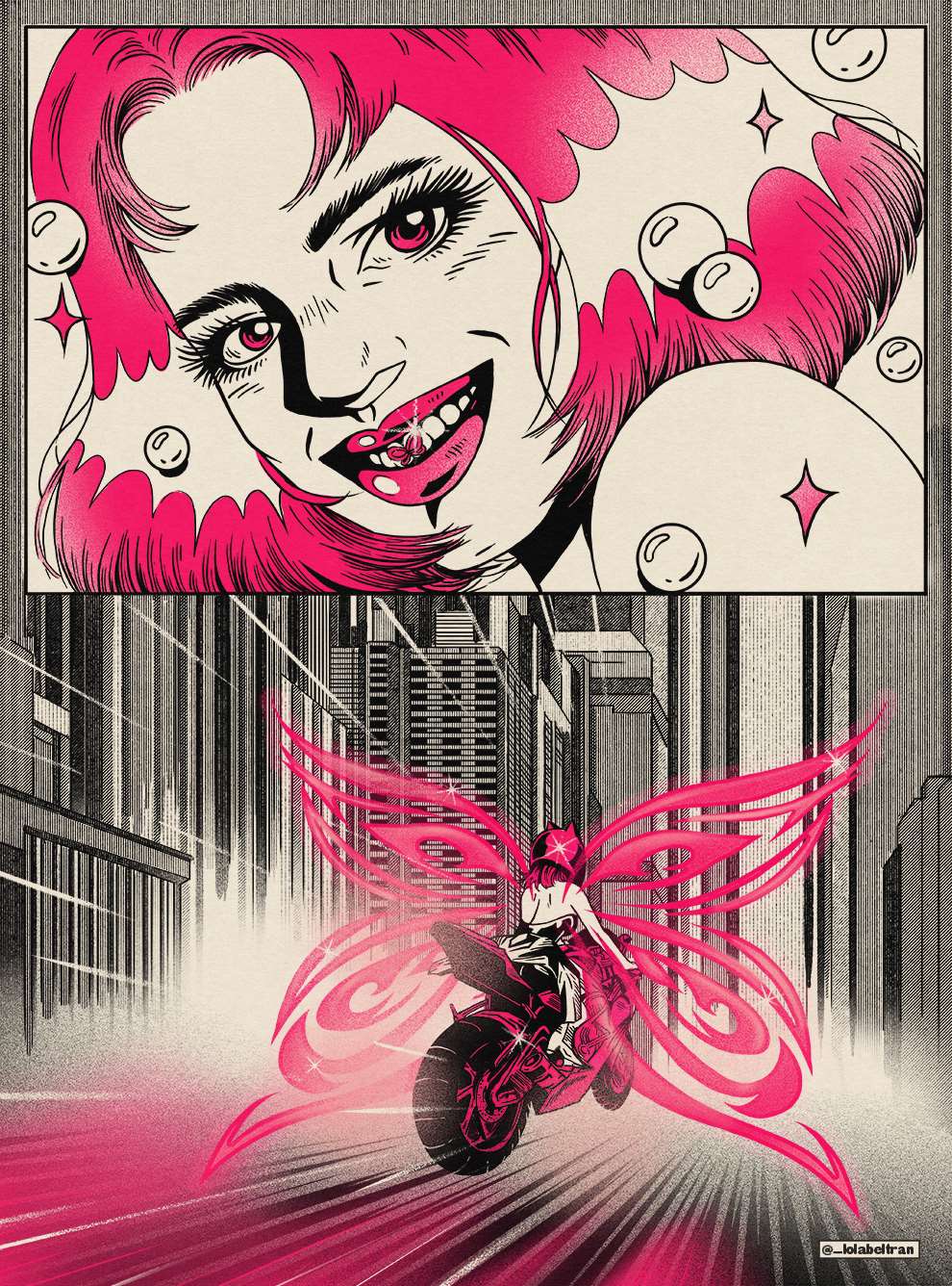 Lola Beltrán is a Spanish graphic artist and illustrator currently based in Valencia, Spain. Lola's style combines anything from comics, manga, animation cartoons, first internet era to classic Hollywood movie posters. Her ability to combine traditional drawing techniques, digital tools, as well as screen printing or lithography, not to mention a huge serving of sass, is truly unique.
